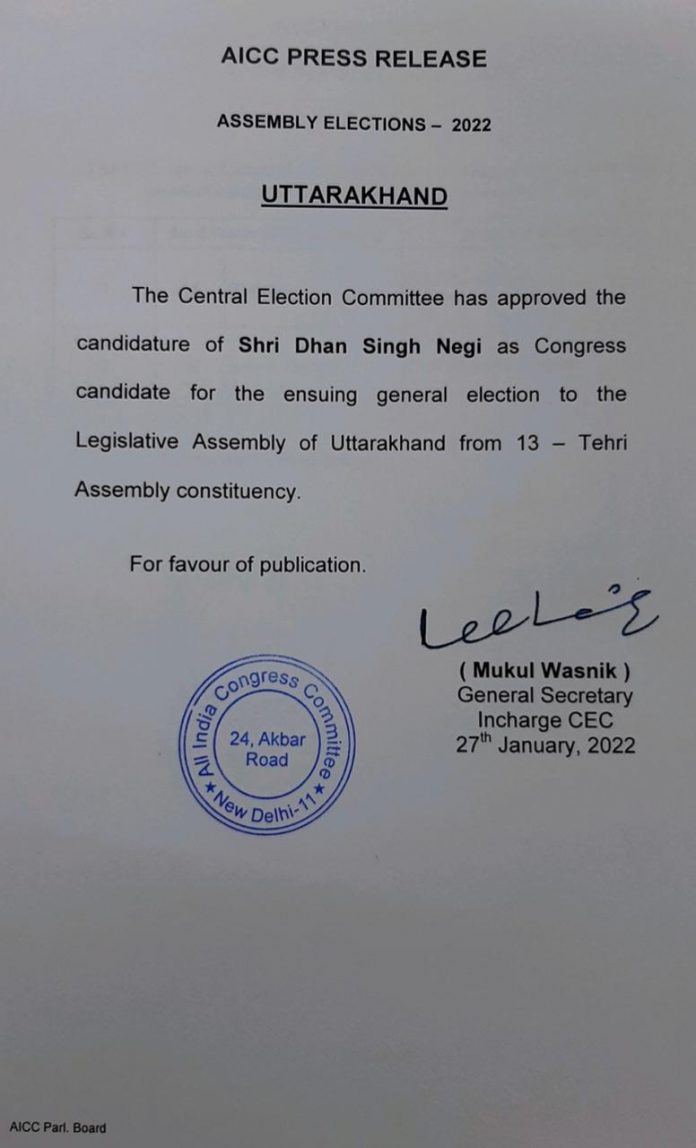 गुरुवार देर शाम को कांग्रेस के राष्ट्रीय महासचिव मुकुल वासनिक की ओर से टिहरी विधानसभा के लिए धन सिंह नेगी को उम्मीदवार बनाने का पत्र जारी किया गया है। धन सिंह आज ही भाजपा छोड़कर हरीश रावत की मौजूदगी में कांग्रेस में शामिल हुए थे। एक अन्य घटनाक्रम में कांग्रेस के पूर्व प्रदेश अध्यक्ष किशोर उपाध्याय ने पार्टी छोड़कर भाजपा में शामिल हो गए। बताया जा रहा है कि किशोर भाजपा से टिहरी उम्मीदवार हो सकते हैं।