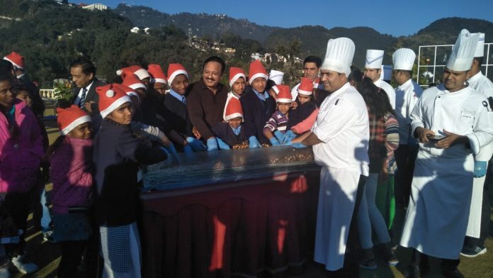 Author Bill Aitken and Ganesh Saili along with hotel guests, students of Nirmala High School, Mussoorie along with the chef and executives of the hotel took part in the hour long cake mixing ceremony.