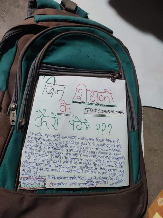 भारत मे शिक्षा के लिए सरकारों ने अनेक अभियान चलाए जिससे सभी बच्चों को शिक्षा प्राप्त हो और उस पर काफी पैसा भी खर्च होता है, पर धरातल पर स्तिथि कुछ अलग नजर आती है. इसका एक नजारा आज टिहरी गढ़वाल के भिलंगना ब्लाक के घोपलधार के राजकीय इंटर कालेज में देखने को मिला ,जहाँ छात्रों ने शिक्षकों की कमी से जूझ रहे सभी छात्रों ने अपने स्कूल बैगों में सरकार और मुख्यमंत्री त्रिवेंद्र रावत के नाम पर एक सन्देश लिखा है।